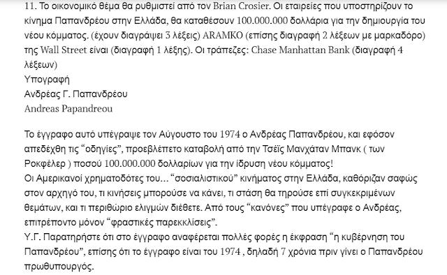Οι τράπεζες Τσεϊς Μανχάταν Μπανκ (διαγραφή τεσσάρων λέξεων). (Yπογραφή στα ελληνικά και από κάτω, Andreas Papandreou).